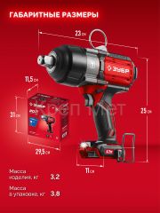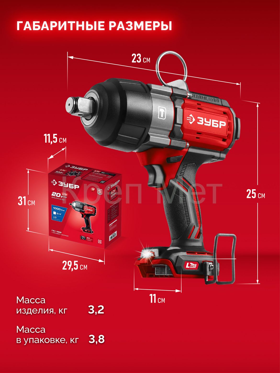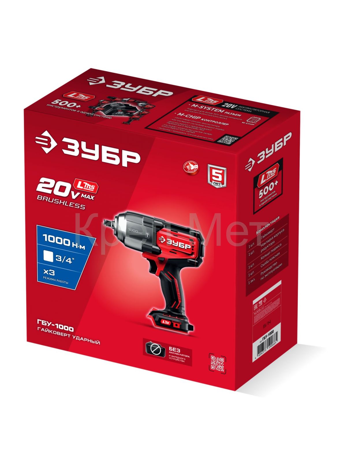- ЗУБР 20 В, 1000 Н·м, без АКБ (LMS), бесщеточный ударный гайковерт (ГБУ-1000)