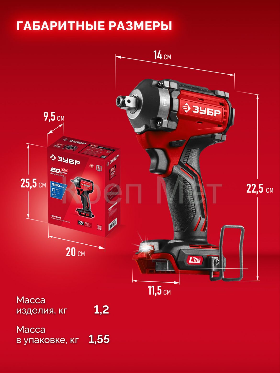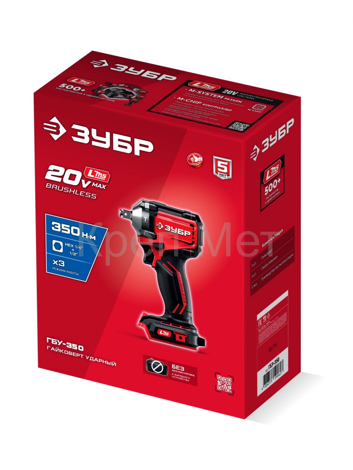 - ЗУБР 20 В, 350 Н·м, без АКБ (LMS), бесщеточный ударный гайковерт (ГБУ-350)
