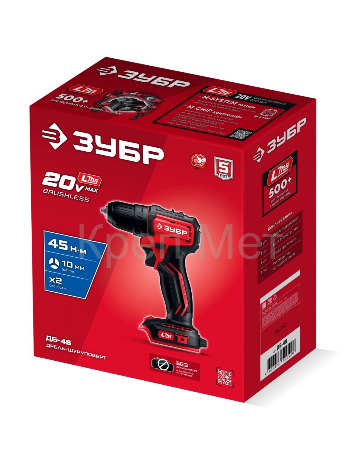 ЗУБР 20 В, 45 Н·м, без АКБ (LMS), бесщеточная дрель-шуруповерт (ДБ-45)