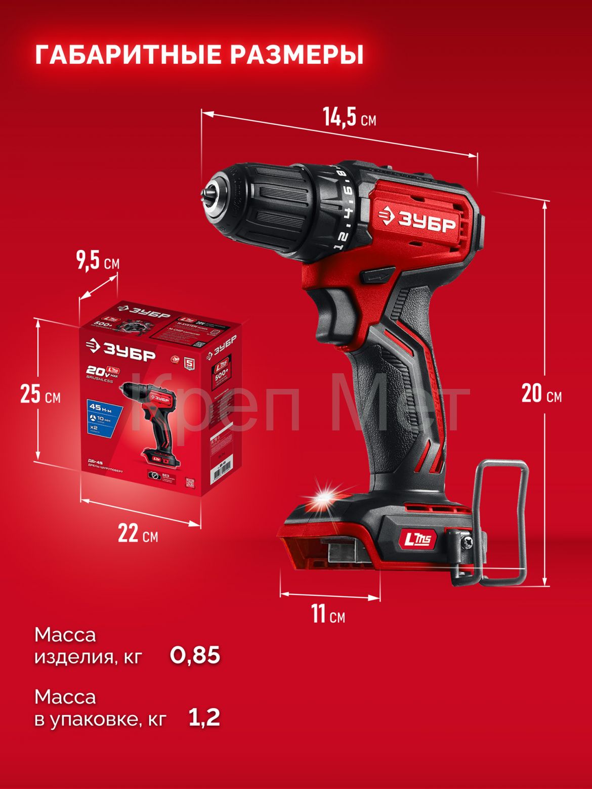 - ЗУБР 20 В, 45 Н·м, без АКБ (LMS), бесщеточная дрель-шуруповерт (ДБ-45)