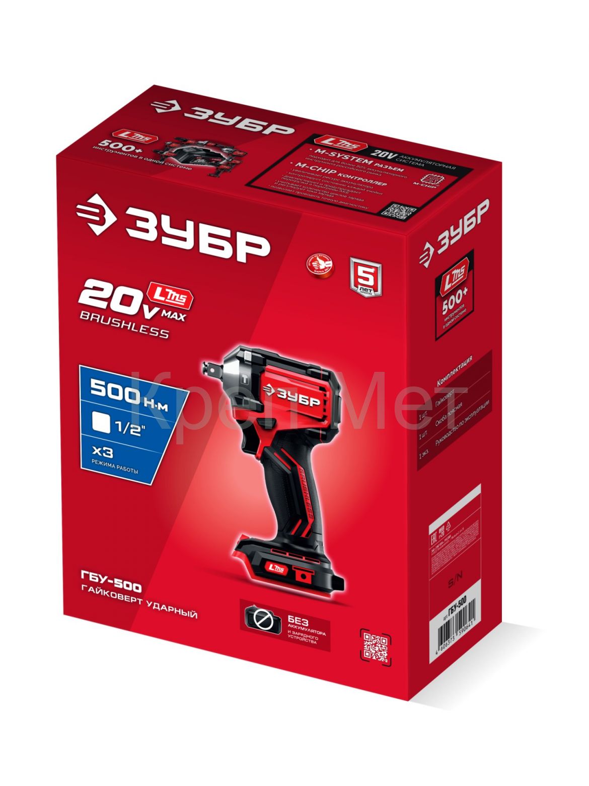 - ЗУБР 20 В, 500 Н·м, без АКБ (LMS), бесщеточный ударный гайковерт (ГБУ-500)