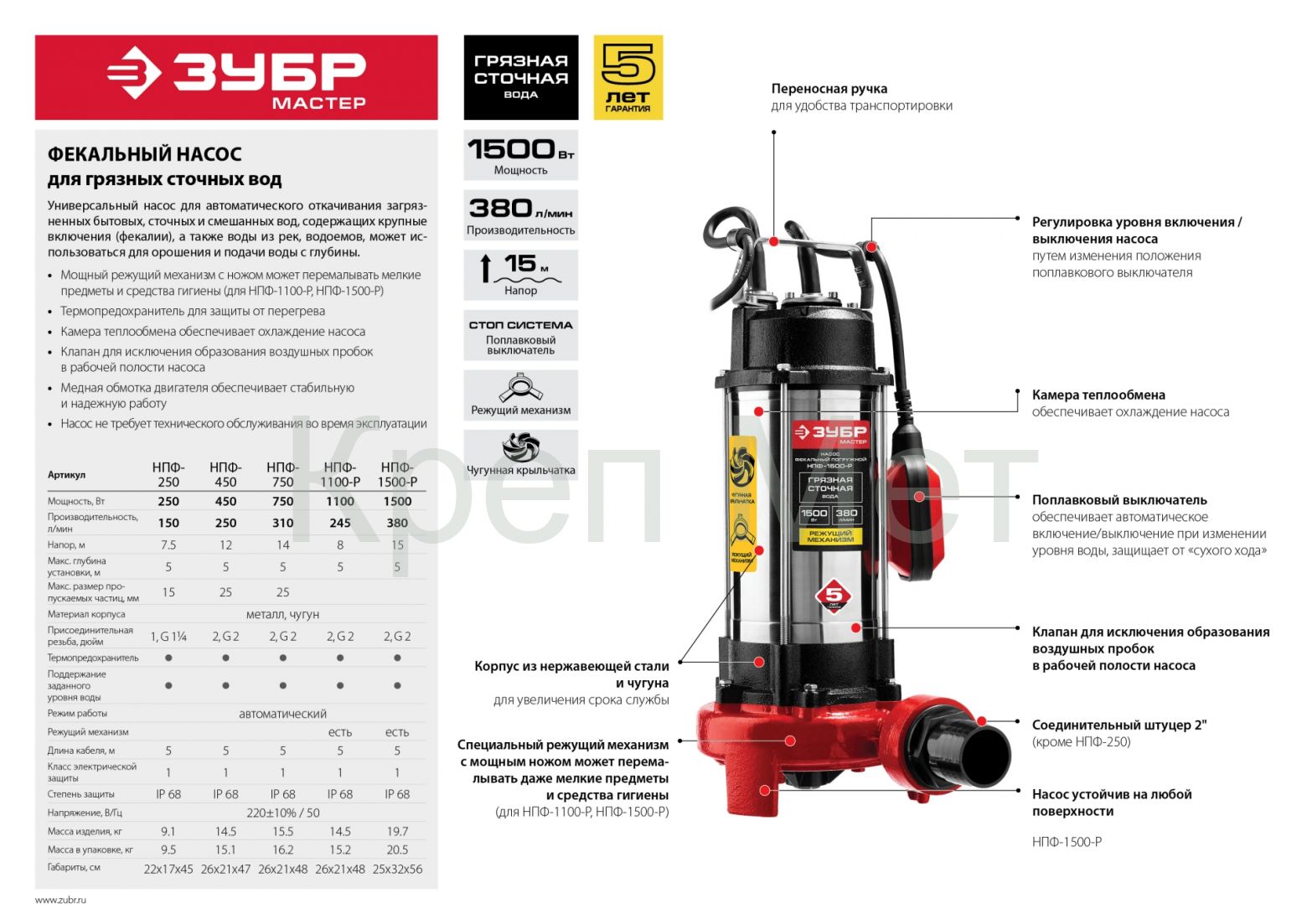 - ЗУБР 450 Вт, фекальный насос (НПФ-450)