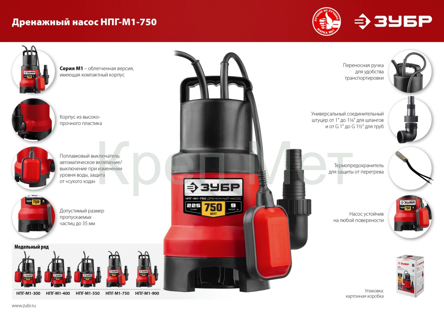 - ЗУБР 750 Вт, дренажный насос для грязной воды (НПГ-М1-750)