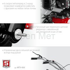 - 6 скорости вперед (понижающая, основная и повышающая) и 2 назад позволяют комфортно работать на любых типах почвы